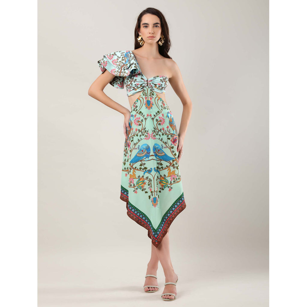 Make a statement with our Amelle Bikini Set, featuring a contemporary off-shoulder design accented with a double ruffle sleeve on one side and a metallic central trim. The high-waisted bottoms provide flattering coverage, while the engineered Shrikalahasti-inspired prints — including elephants and lush flora — infuse heritage artistry into a modern, elegant beachwear silhouette.