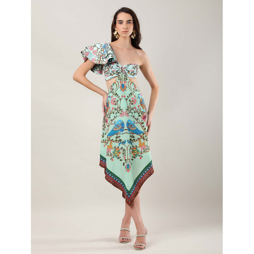 The Amelle coverup is a versatile, removable layer crafted from lightweight crepe, designed to attach seamlessly to the Amelle Bikini Top. Featuring an elasticated back and a flowing handkerchief hem, it is adorned with an engineered Shrikalahasti-inspired print of peacocks, florals, and flora motifs in rich brown and blue hues. This elegant piece adds a refined, artistic flair to your swim ensemble, perfect for effortless resort-side sophistication.