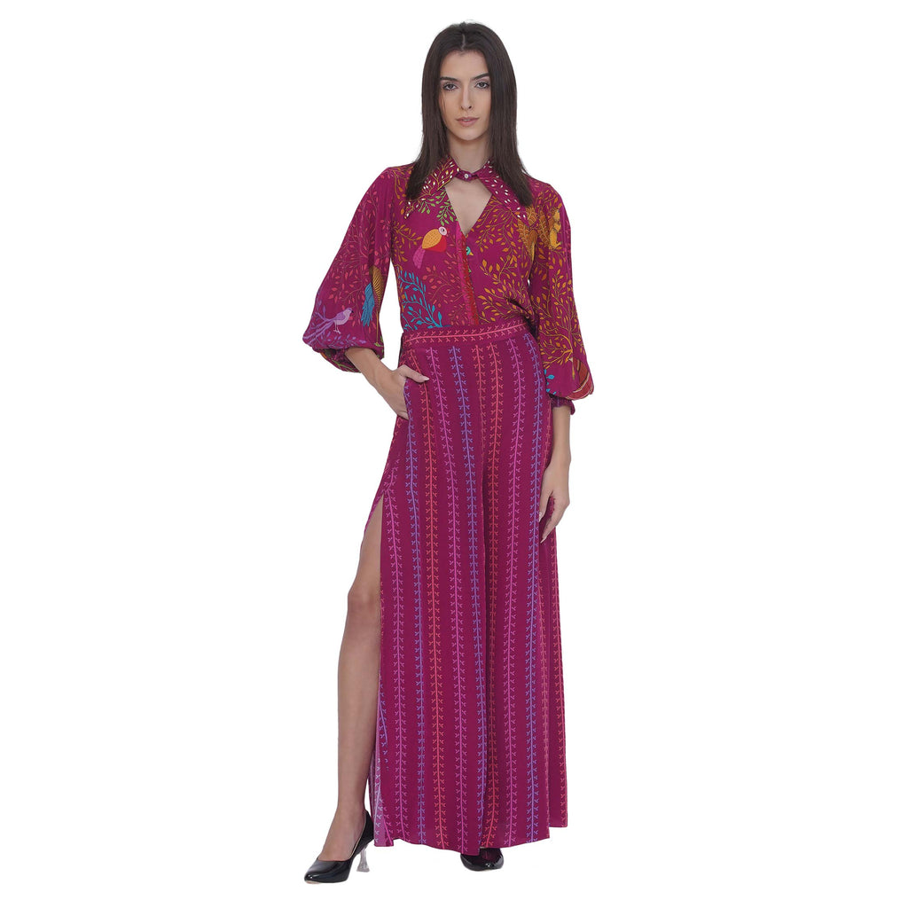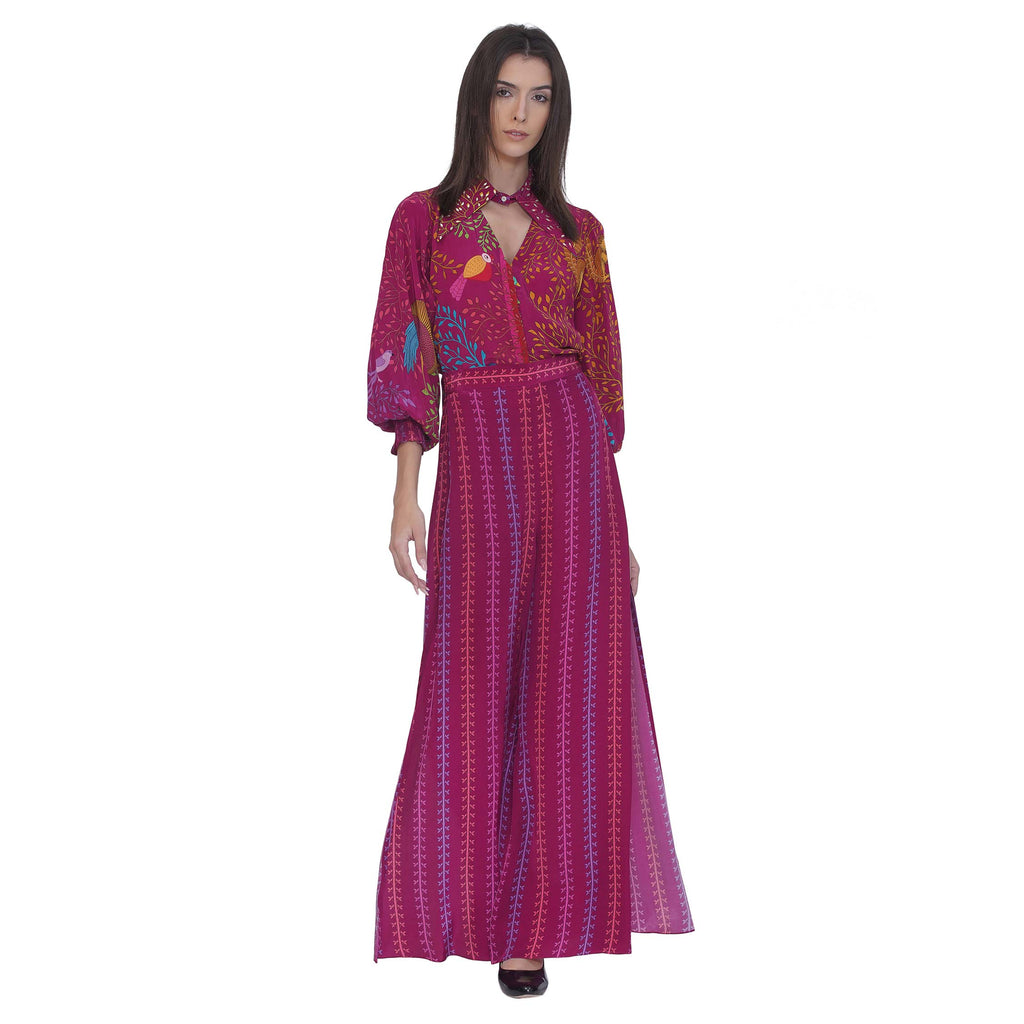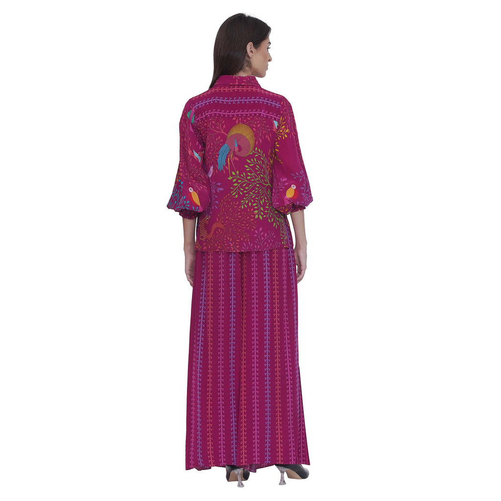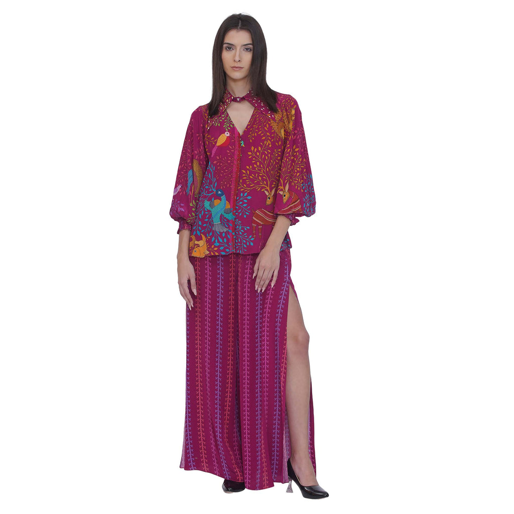 Make a striking statement with these flared pants, showcasing intricate placement prints inspired by the rich artistry of Gond and Madhubani. Designed with elegant side slits, they exude effortless charm, offering a perfect blend of cultural heritage and modern style.