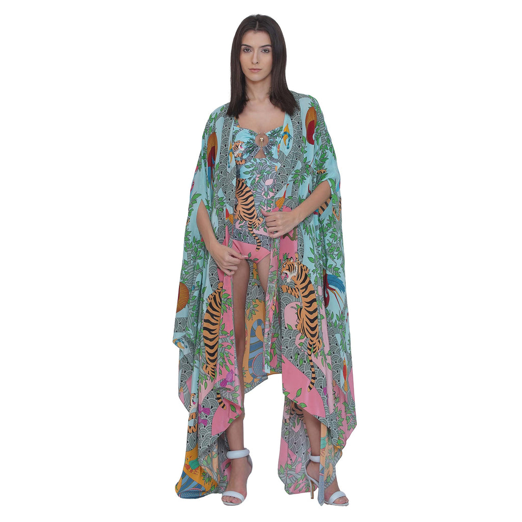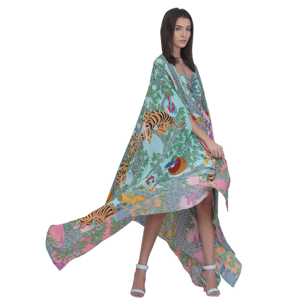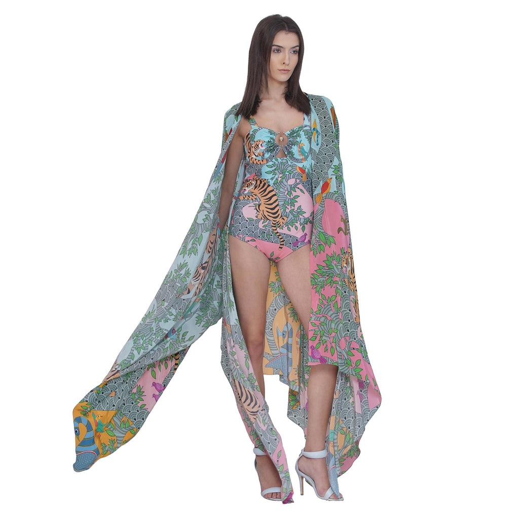 Add a touch of romance to your ensemble with our statement engineered print cape, adorned with intricate detailing inspired by the vibrant artistry of Gond. Crafted from luxurious crepe fabric, this long and relaxed cape is perfect for layering over a swimsuit or outfit of your choice.