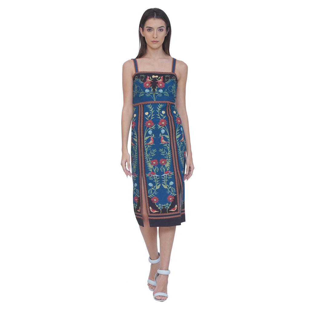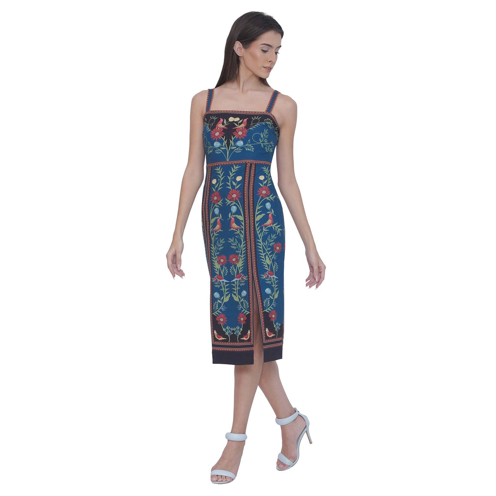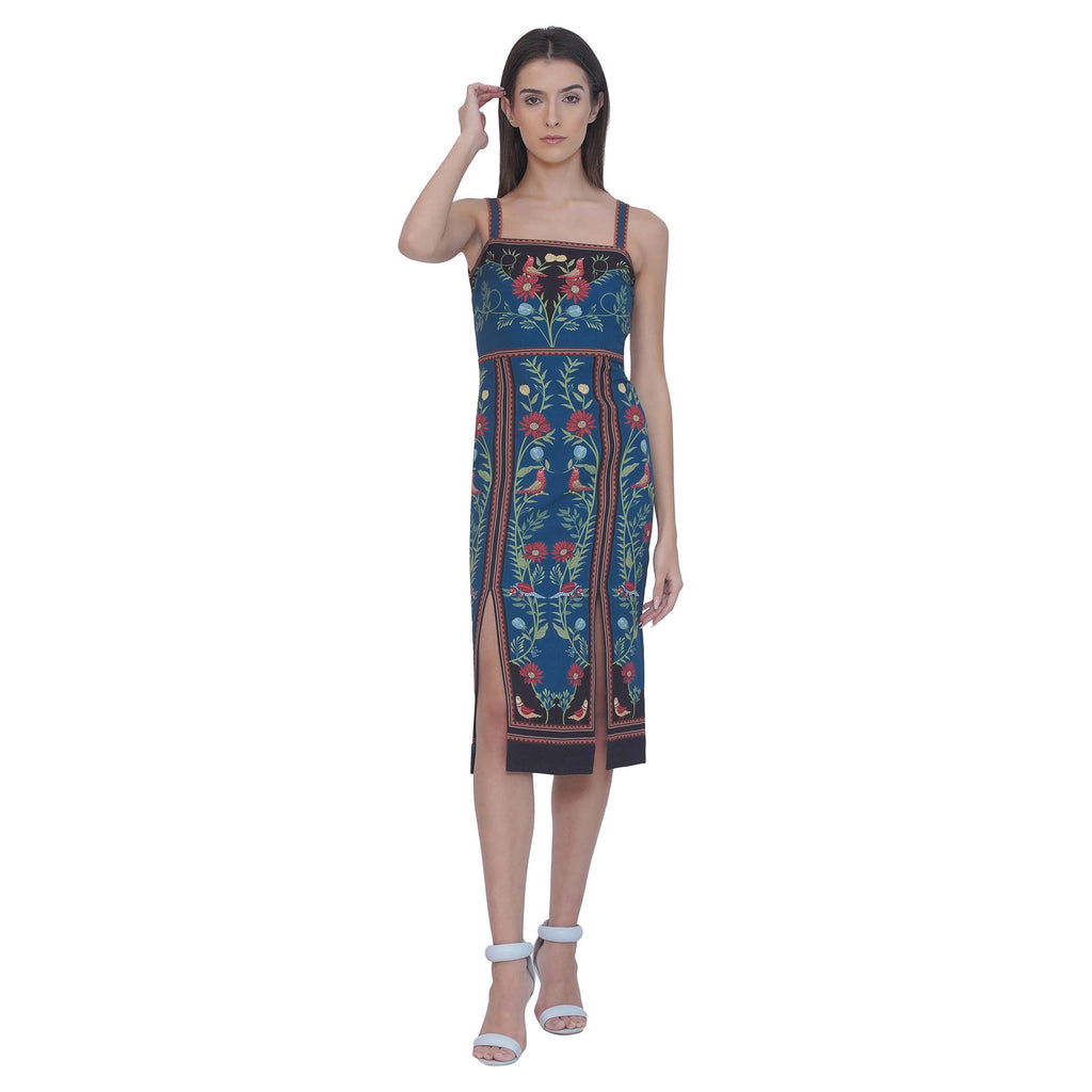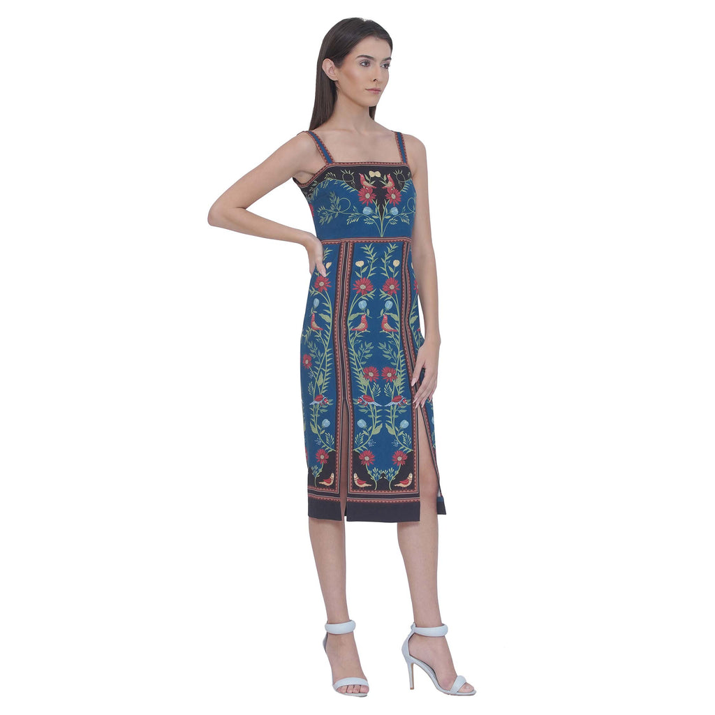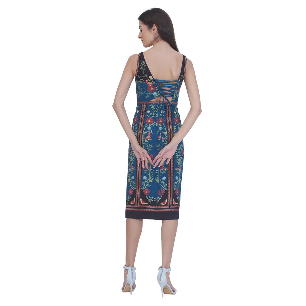 Turn heads with this fitted dress, showcasing a square neckline, a front slit, and an asymmetrical back design with tie-up detailing and rivet accents. Crafted with a placement print inspired by the vibrant motifs of the Gond art, this dress blends timeless elegance with a bold contemporary edge, making it a standout choice for any occasion.