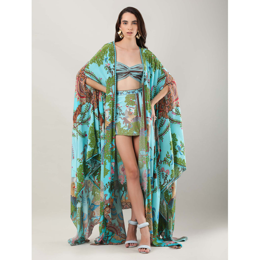 Add a touch of romance to any ensemble with our statement cape, adorned with intricate Shrikalahasti-inspired detailing. Crafted from sumptuous crepe, its long, relaxed silhouette is perfect for layering over a swimsuit or outfit of your choice. The statement border, featuring flora, fauna, peacocks, and elephant motifs, along with delicate shoulder embroidery, elevates this piece into a truly show-stopping addition to your wardrobe.