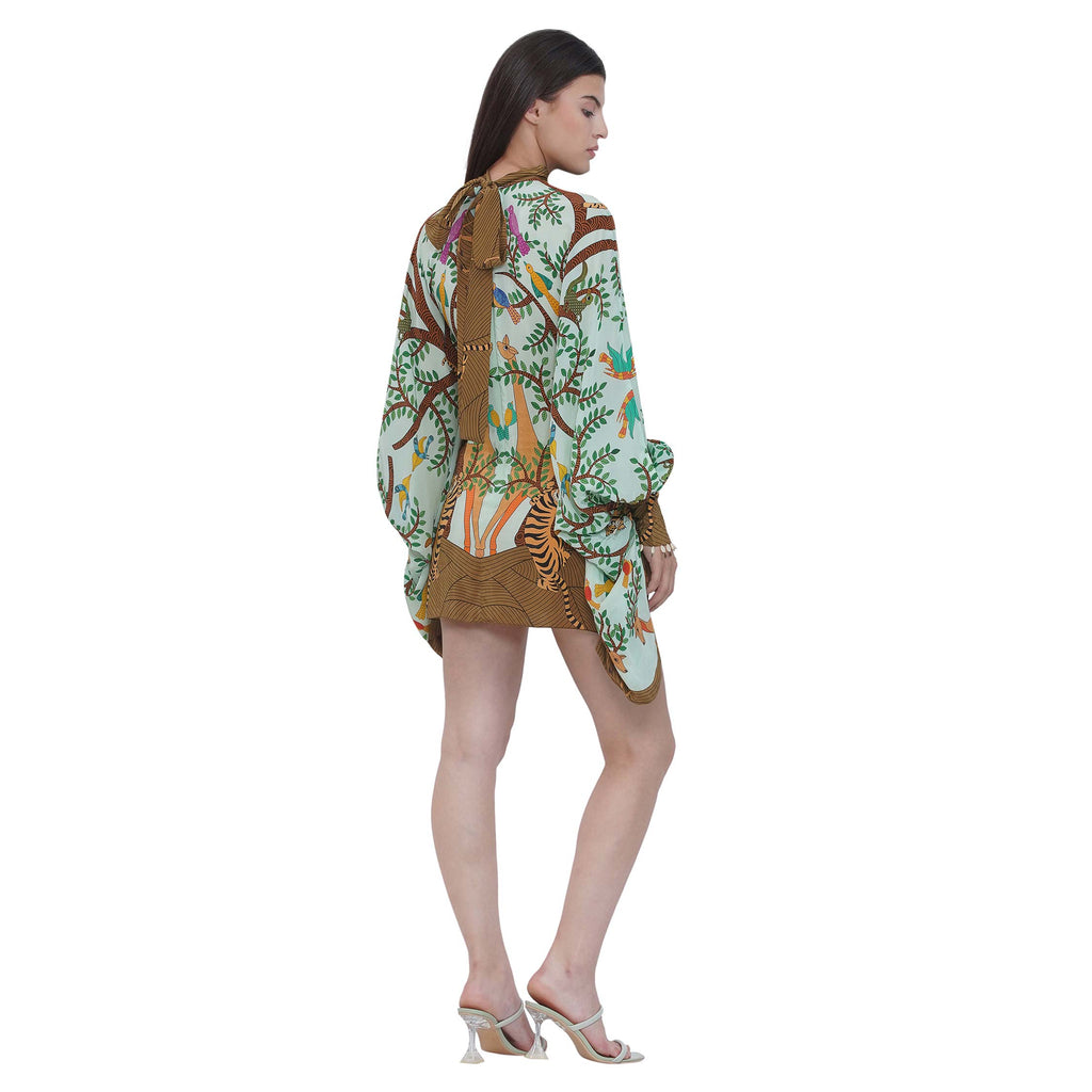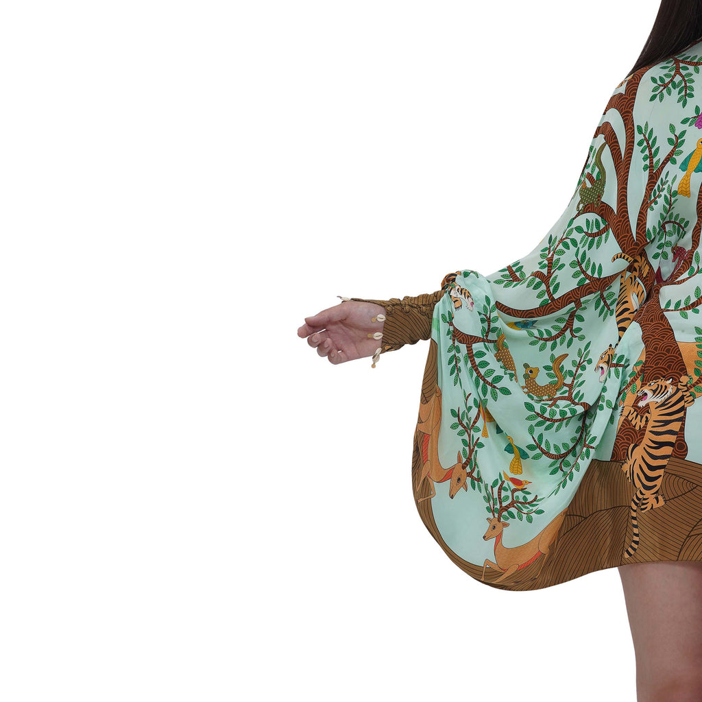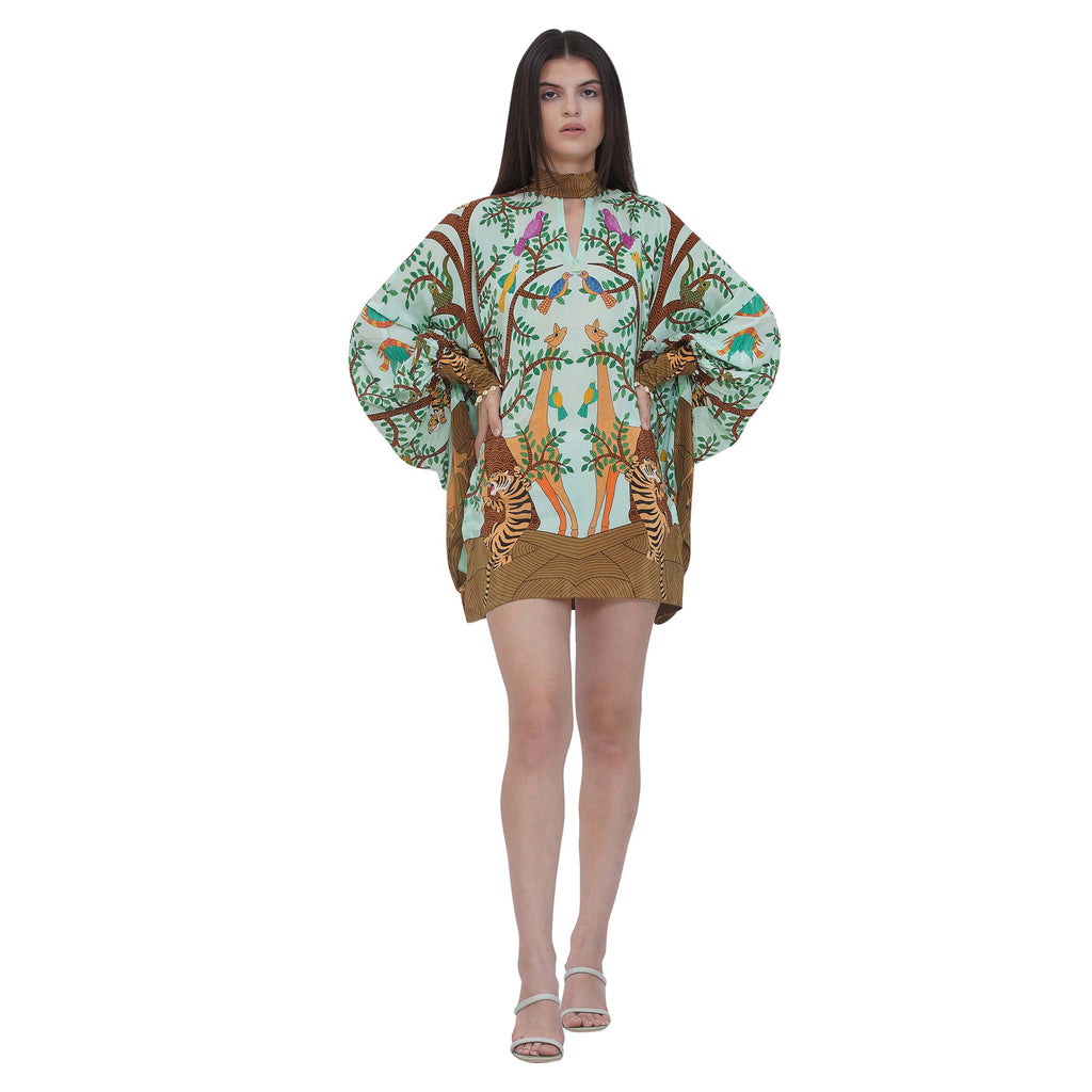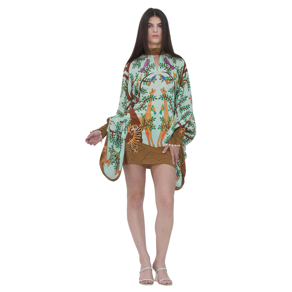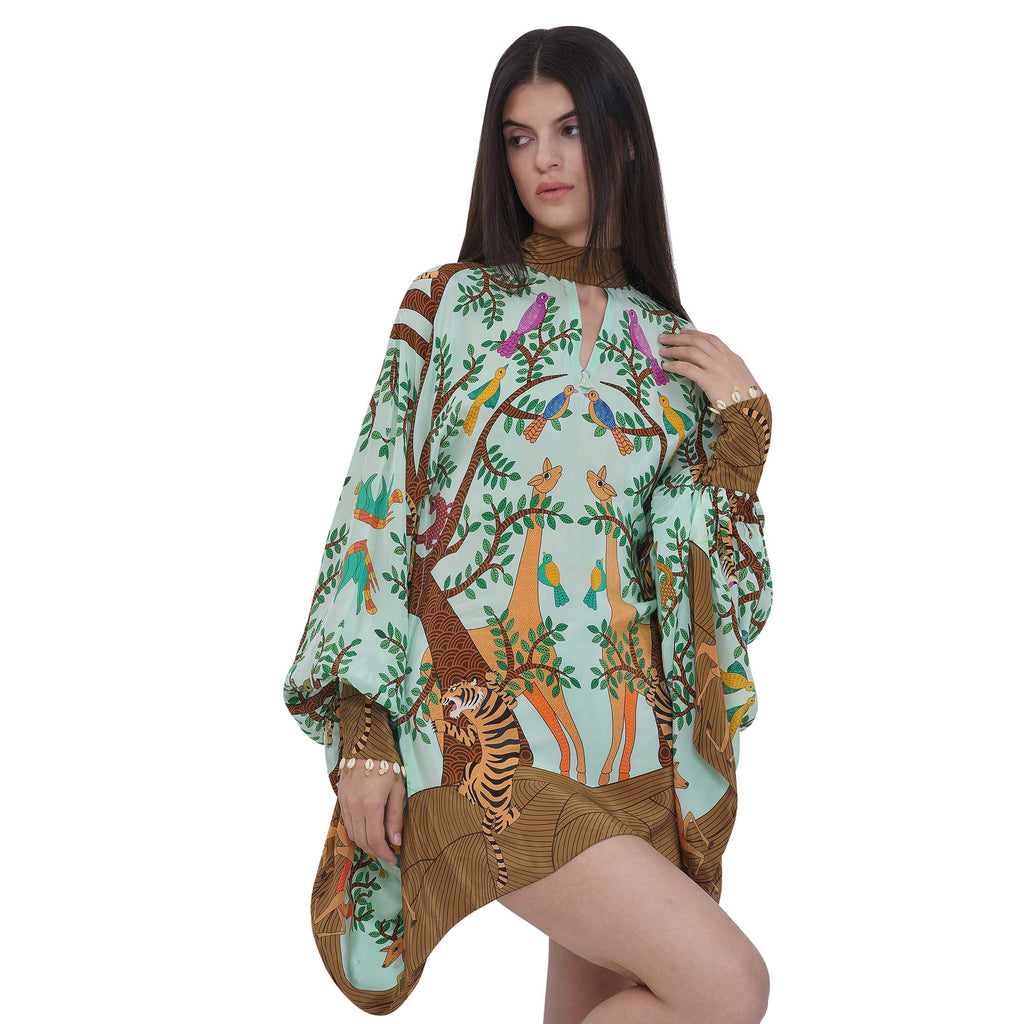 Make a statement with this asymmetrical cuff kaftan, featuring shell tassel details for added texture and charm. The full sleeves are enhanced with pleats, while the center trim adds a refined touch. Designed with a flattering short silhouette and a small cut-out detail in the front, this free-size kaftan dress blends effortless elegance with a contemporary twist. Inspired by the vibrant motifs of Gond art, it captures a fusion of tradition and modern flair.
