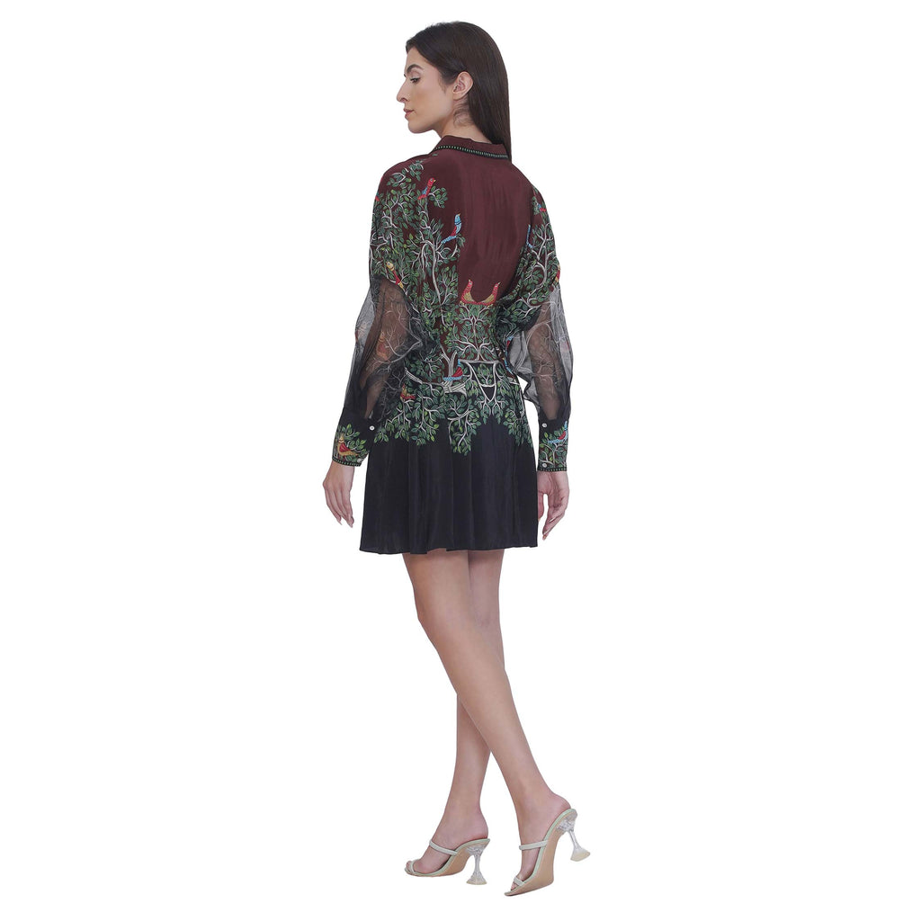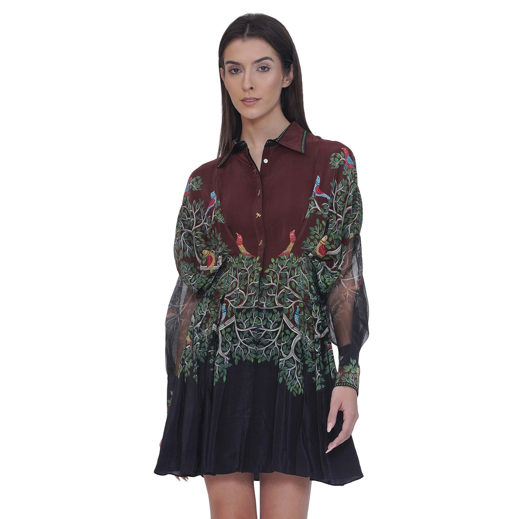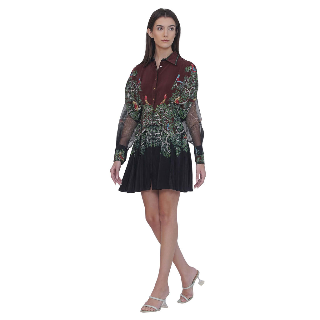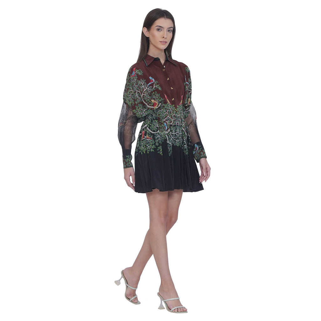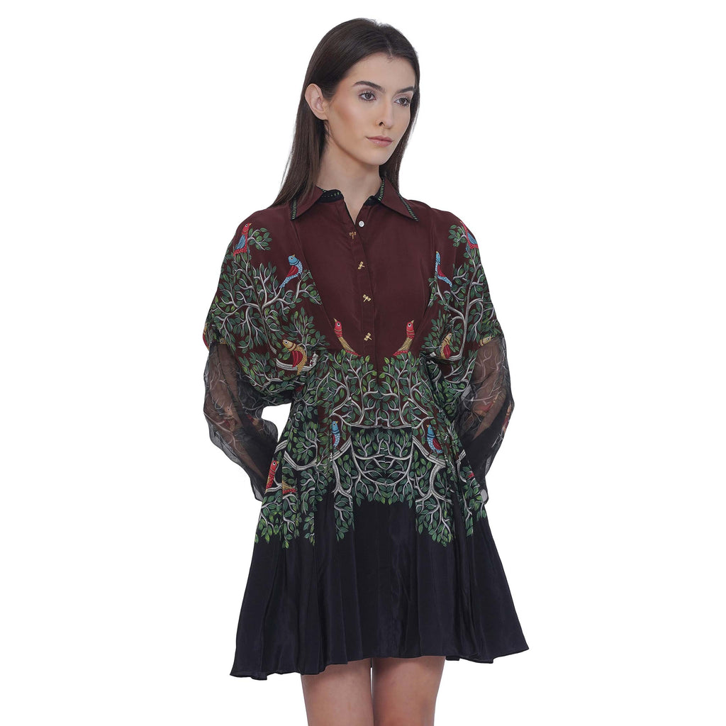 Exude effortless elegance with this draped dress, featuring a cinched waist for a flattering silhouette. Crafted from luxurious crepe, it is paired with draped sleeves in sheer organza for a touch of delicacy. The relaxed fit of the sleeves, complemented by refined cuff detailing and embroidery on the font opening, adds to its understated charm, making it perfect for both day and evening occasions.