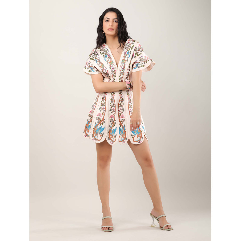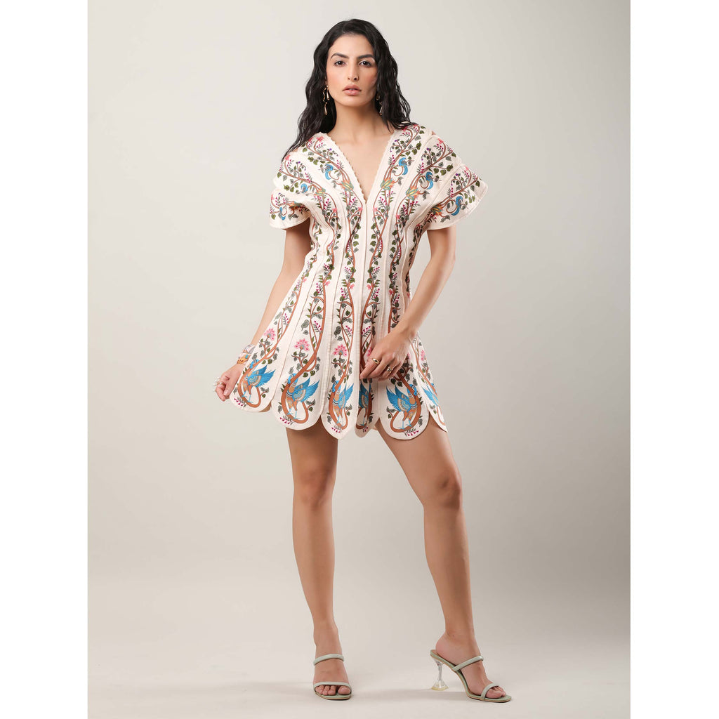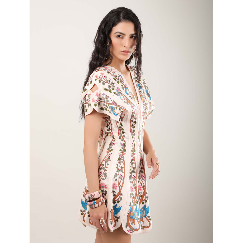 Crafted from luxurious cotton satin, this short dress features meticulously engineered panels in scalloped formations along the bodice and hem — each adorned with artwork inspired by Shrikalahasti. Every panel is individually printed and seamlessly stitched together, creating a harmonious play of art and structure. Delicate pearl embroidery graces the neckline, while subtle keyhole details at the shoulders and a refined belt at the back add an element of modern femininity. A perfect blend of craftsmanship and charm, this piece captures timeless artistry in a contemporary silhouette.