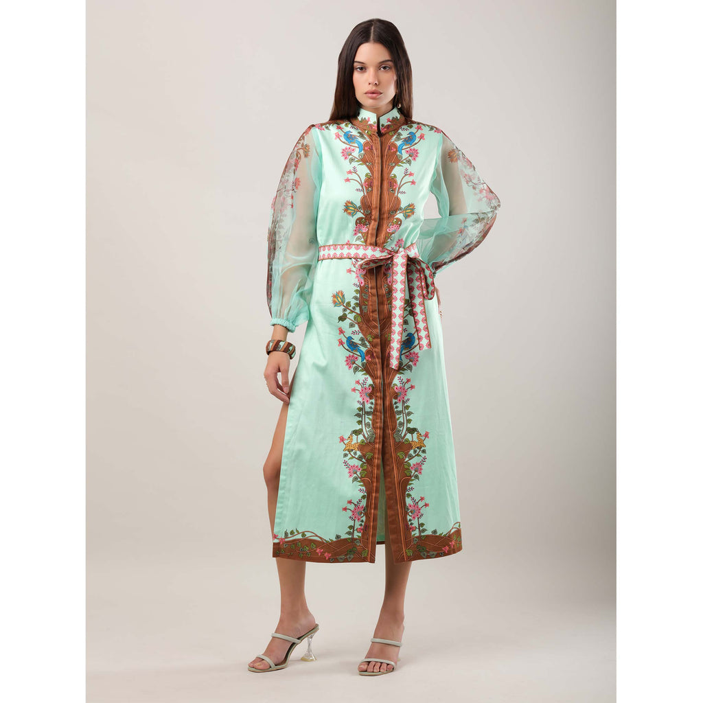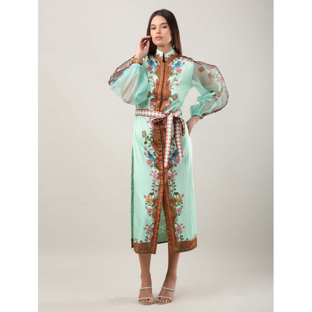 Elevate your wardrobe with this long button-down dress in soft cotton satin. Featuring a high collar, delicate embroidery up to the waist, and balloon organza sleeves, it’s finished with a tie-up belt for a flattering silhouette. Rendered in engineered prints inspired by Kalamkari paintings, it effortlessly blends artisanal charm with modern elegance.