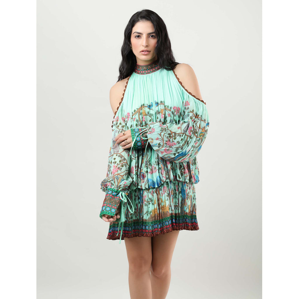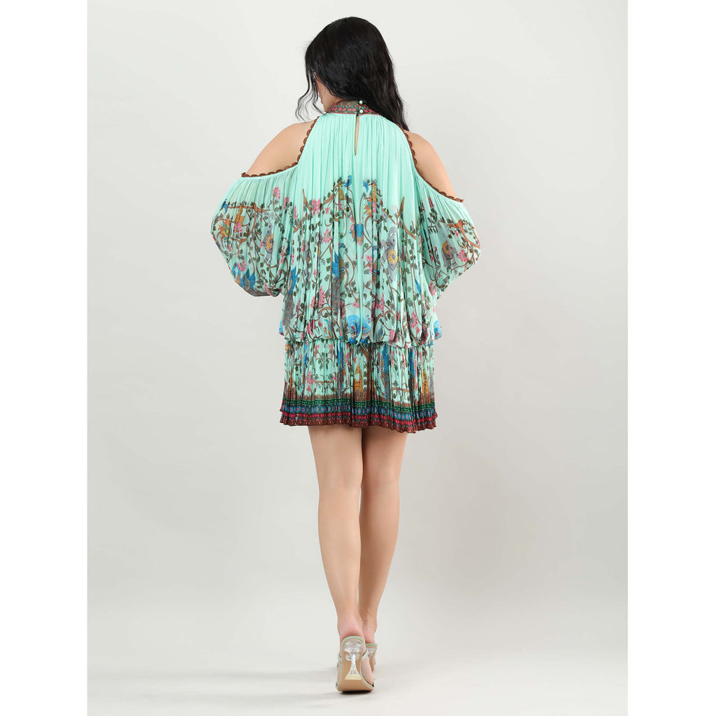 Bring a playful yet polished charm to your wardrobe with this pleated dress, crafted from luxe georgette and adorned with engineered prints inspired by Kalamkari paintings. Designed in soft hues, it features delicately embroidered sleeves that add an artisanal touch. Effortlessly blending tradition with contemporary design, this dress is a versatile statement for both daytime elegance and evening sophistication.