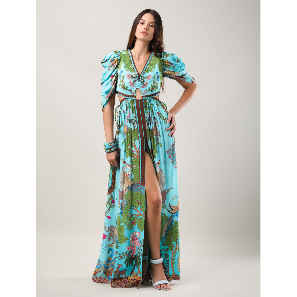 The Selorica Dress is crafted in luxe crepe with engineered prints inspired by Kalamkari artistry. Designed with draped sleeves and a cinched waist tie-up, it blends fluidity with structure. Intricate embroidery highlights the neckline and back, while a central trim and delicate back tie-up add refined detailing, making it a statement of effortless elegance.