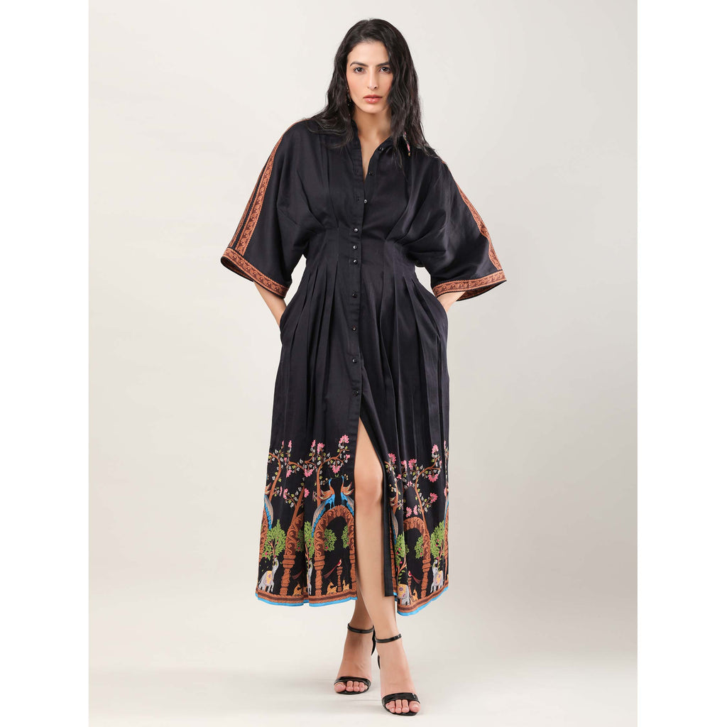 Celebrate effortless elegance with this calf-length dress, crafted in soft cotton satin and adorned with prints inspired by timeless Kalamkari paintings. Featuring draped sleeves, a fitted waist, and a flowing skirt, it offers a flattering silhouette, while delicate embroidery at the collar adds a refined, artisanal touch — perfect for daytime gatherings or festive occasions.