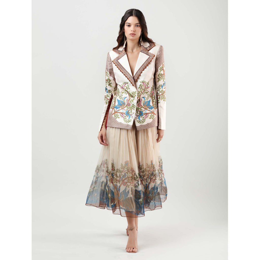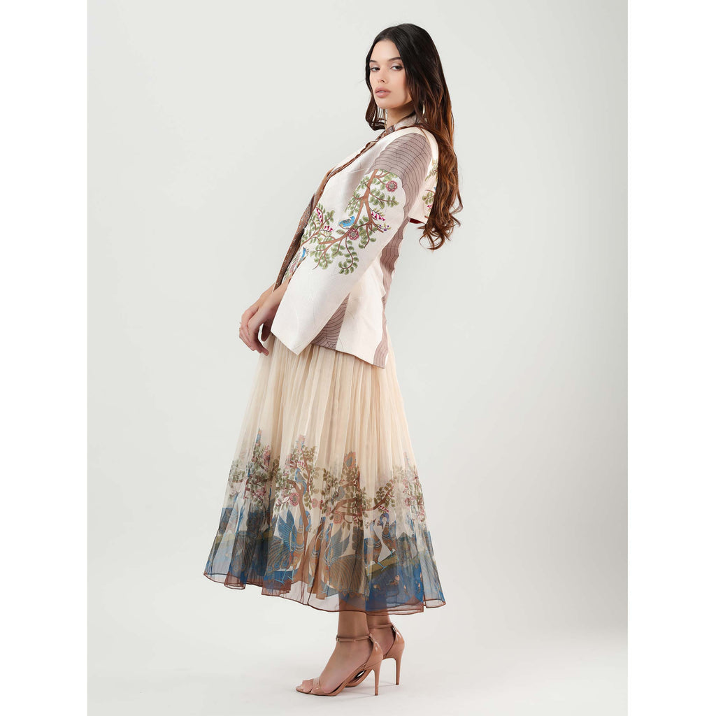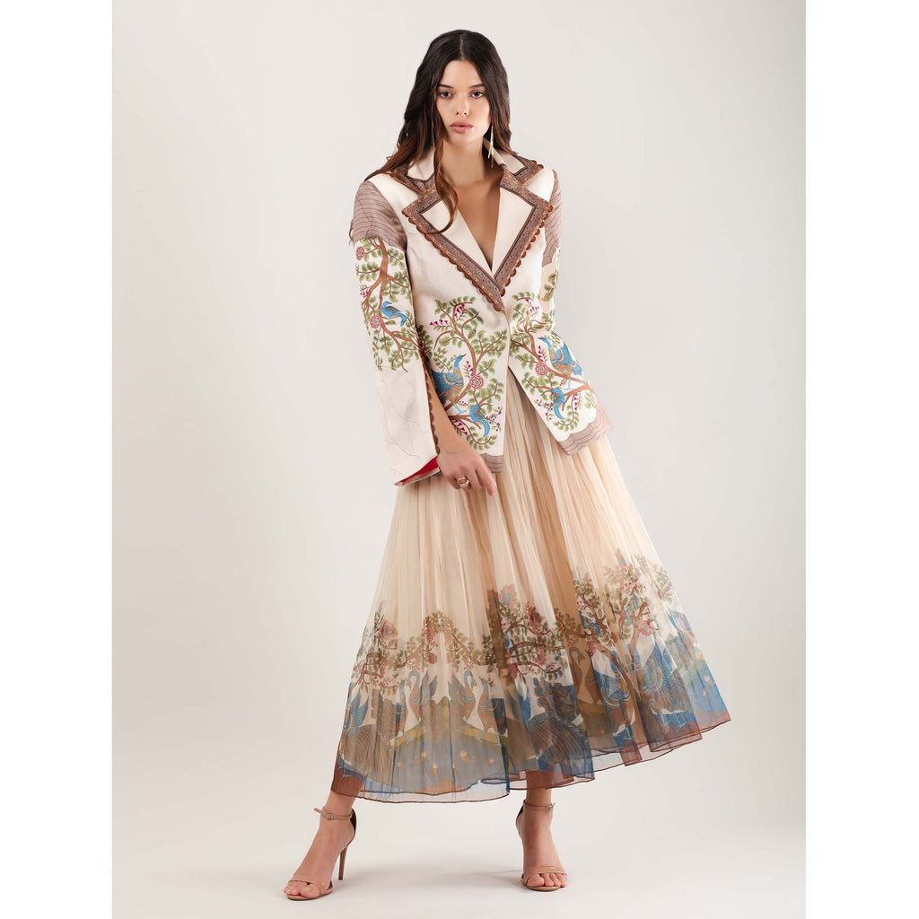 Crafted in delicately textured Scallop Texture Satin fabric, the Evona Jacket features sculpted lapels and fluid slit sleeves that open elegantly from wrist to elbow — a subtle nod to architectural precision. Intricate Scallop Texture Satin embroidery graces both the lapel and sleeves, adding a touch of ornate refinement. Adorned with engineered artwork inspired by Shrikalahasti, this statement jacket seamlessly blends art and structure, making it a versatile layer — captivating whether paired with co-ords or worn as a standalone piece.