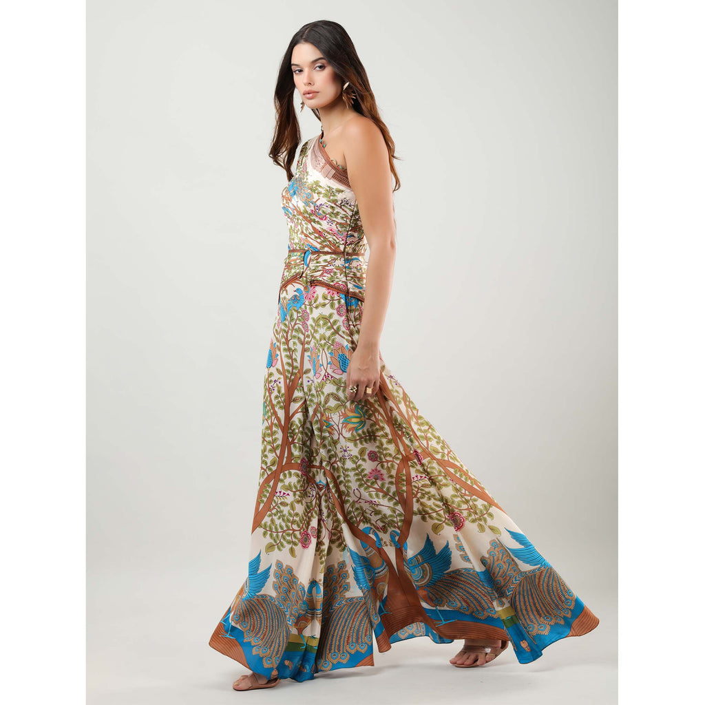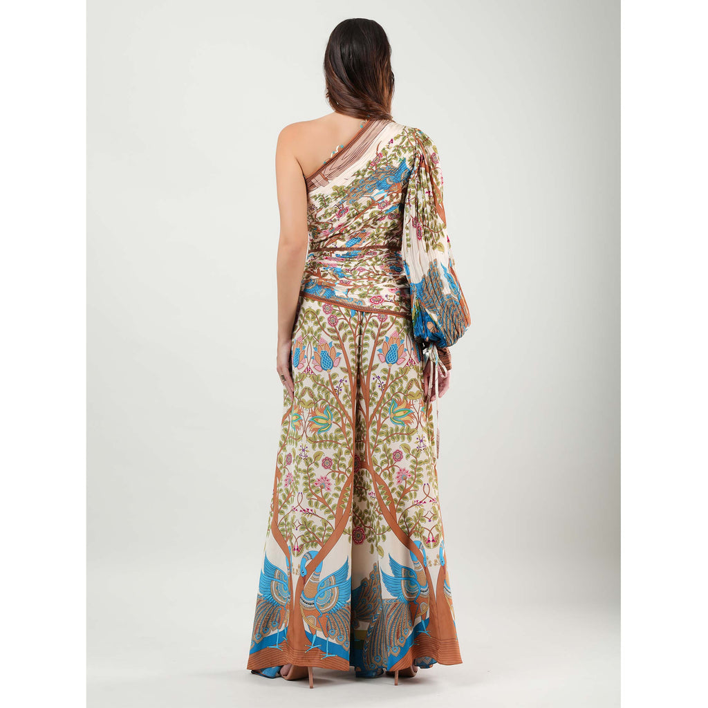 Command attention in this one-shoulder jumpsuit, distinguished by a sculptural balloon sleeve and a delicately embroidered neckline. A refined trim accentuates the waist belt, lending structure and sophistication to its contemporary silhouette. Tailored to perfection, it strikes the ideal balance between elegance and ease. Adorned with artwork inspired by the Shrikalahasti art form, this statement piece transitions seamlessly from sunlit soirées to evening revelry.