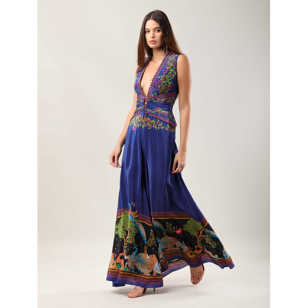 Redefine contemporary elegance in this statement jumpsuit, crafted from luxe crepe with prints inspired by timeless Kalamkari paintings. Designed with a flattering V-neckline highlighted by delicate embroidery, it features a pleated twisted back for added allure and a golden metallic trim at the waistband that accentuates the silhouette. A perfect fusion of tradition and modernity, ideal for festive evenings and chic celebrations.
