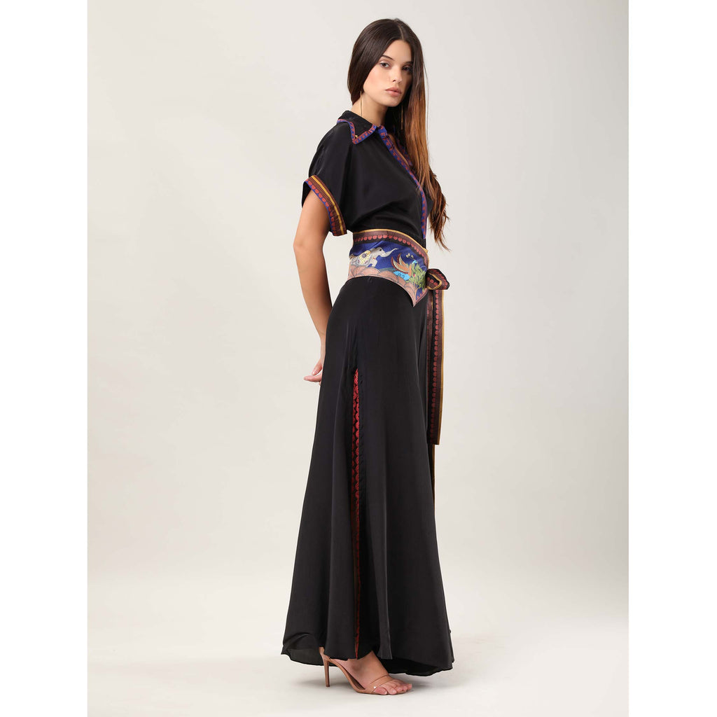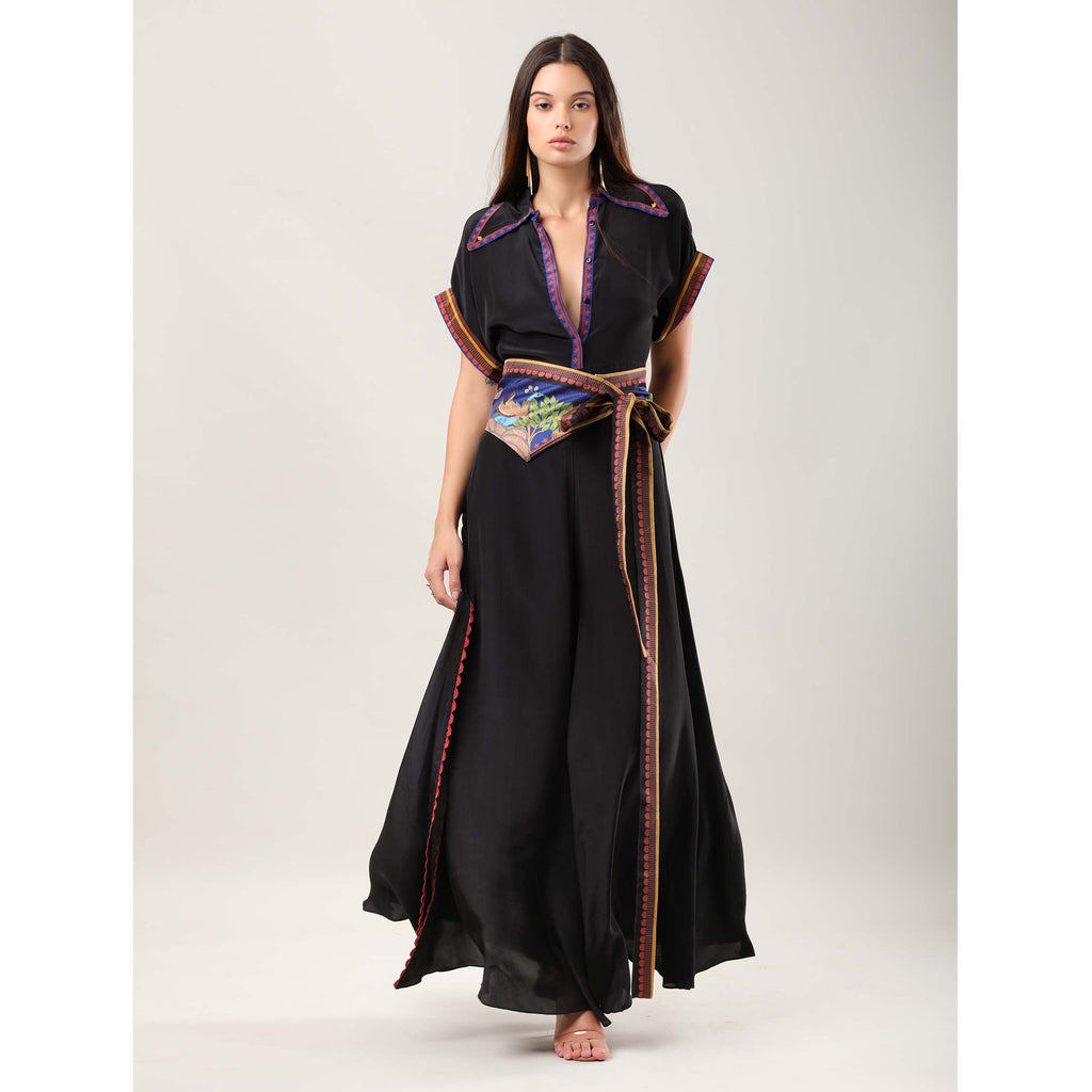 Command attention in the Revera Jumpsuit, crafted from luxurious crepe and accented with a statement printed belt featuring engineered Kalamkari-inspired artwork. The belt cinches the waist while adding a contemporary edge, complementing a flattering silhouette enhanced with side slits detailed in delicate scallops. Versatile and effortlessly elegant, this piece transitions seamlessly from daytime lunches to evening soirées, making a striking style statement at every occasion.