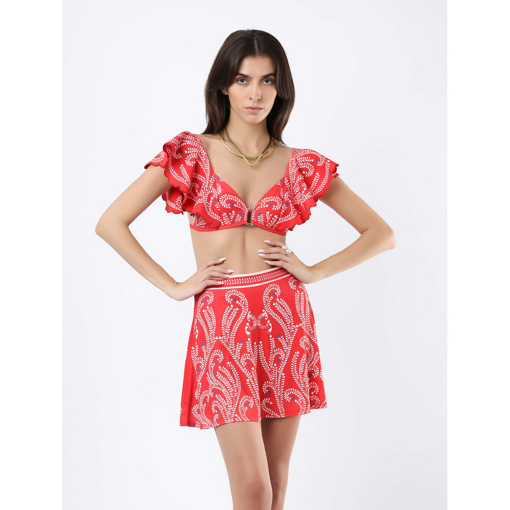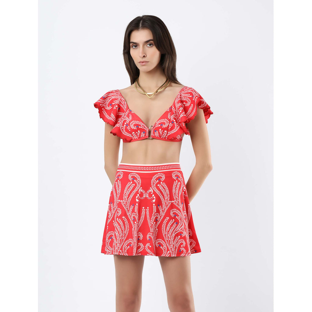 Crafted for refined resort dressing, this swim skirt from our Talesa collection reflects the artistry of Warli and Saura traditions through intricately placed flowing foliage motifs. A finely detailed waistband frames the silhouette, adding definition and structure, while the fluid fall lends an effortless sense of movement. Refined yet versatile, it pairs seamlessly with coordinated swimwear or statement separates.