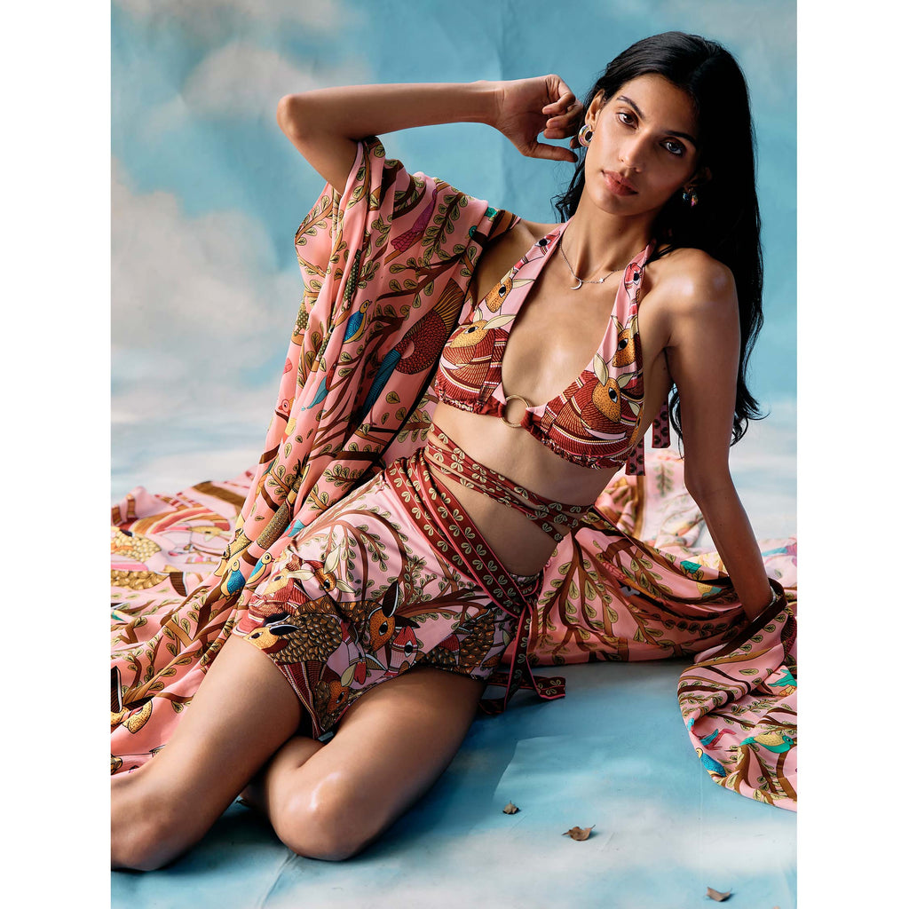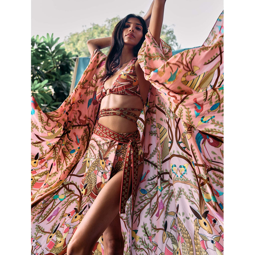Make an impression with our statement cape, a relaxed and long silhouette perfect for layering. Featuring elegant sleeves and beautifully placed prints inspired by the intricate artistry of Gond traditions, this cape effortlessly combines cultural richness with contemporary style. Whether paired with swimwear or casual outfits, it adds a touch of sophistication to any look.