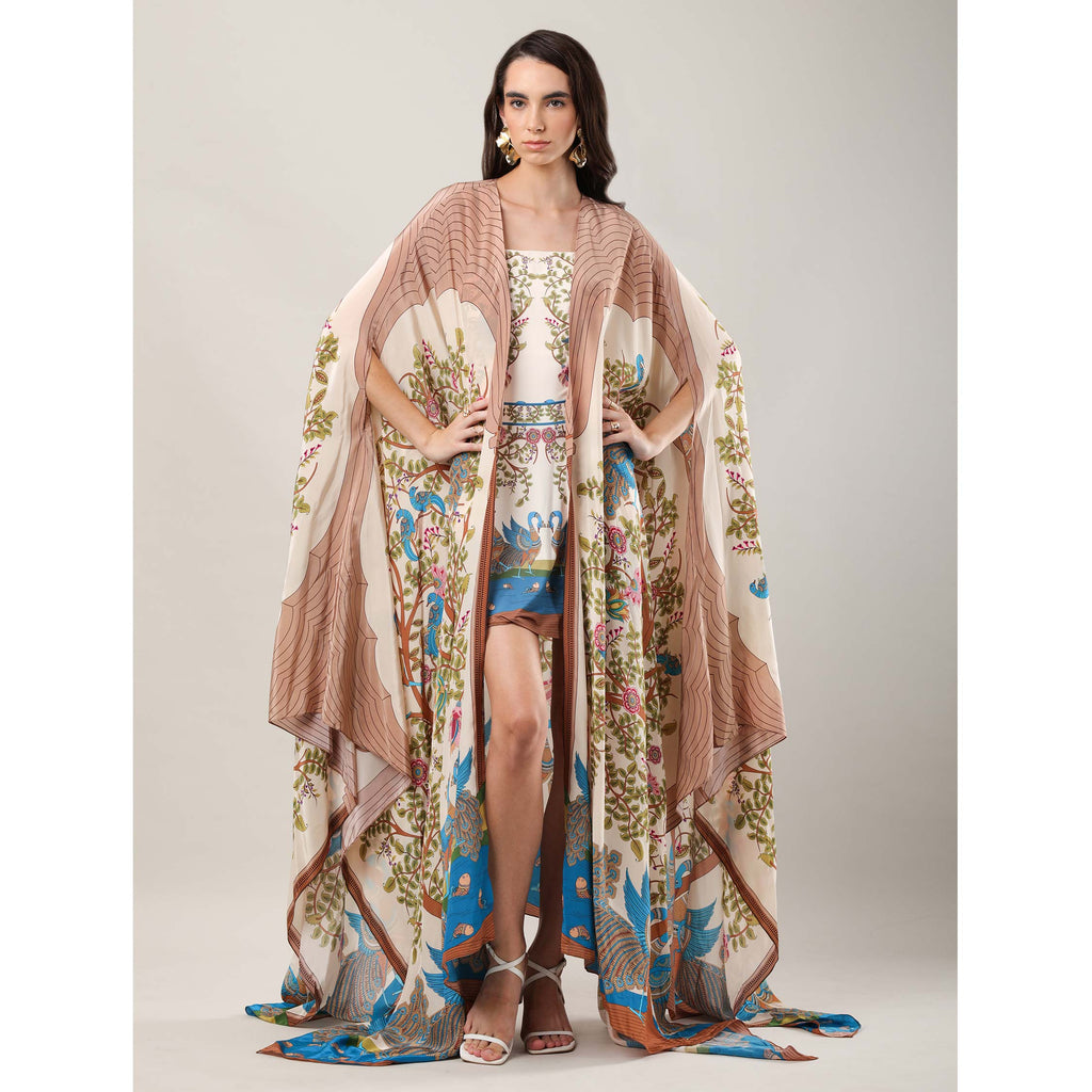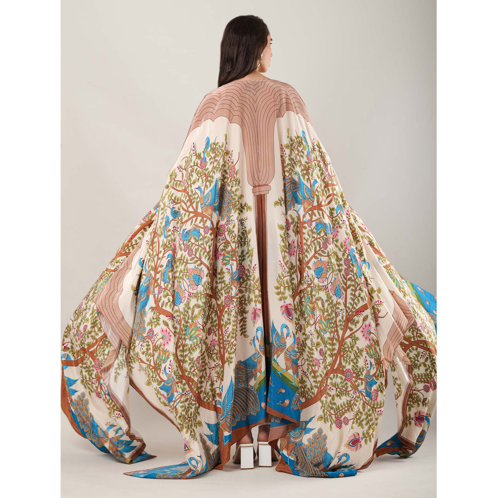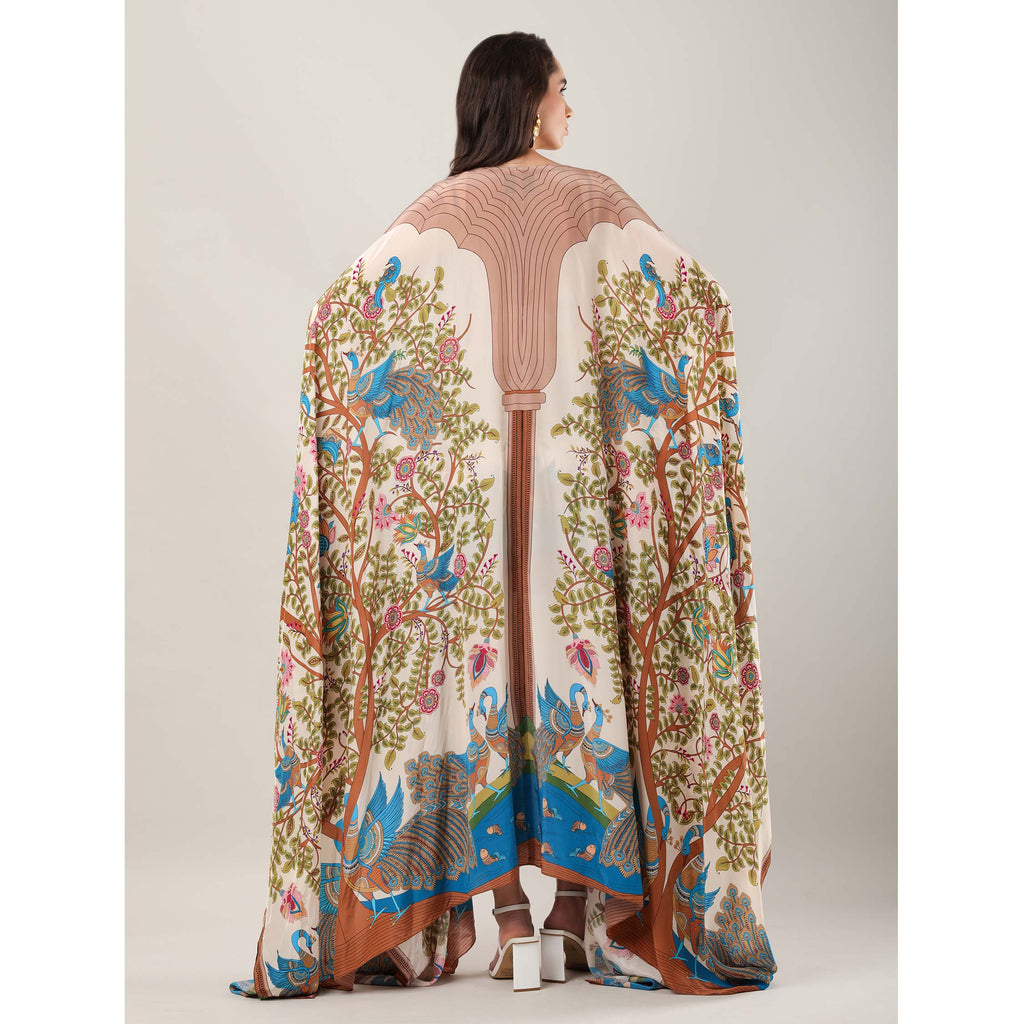 Add a touch of romance to your resort ensemble with our Crescenta Cape, a flowing silhouette adorned with motifs inspired by the Tree of Life from Shrikalahasti Kalamkari art. Crafted in luxurious crepe, this long, relaxed layer drapes beautifully over swimwear or separates. The intricate artwork and artisanal detailing lend it a poetic charm, making it the perfect statement for sunlit escapes.