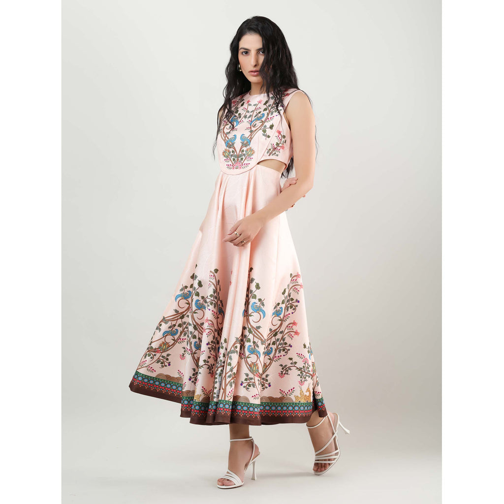 Bold yet refined, this dress is crafted from textured satin and features an engineered print inspired by Kalamkari artistry. A meticulously designed circular yoke and subtle side cutouts at the waist lend a modern, architectural edge while flattering the form. The result is a striking fusion of tradition and contemporary allure — a statement piece that transitions effortlessly from daytime chic to evening sophistication.