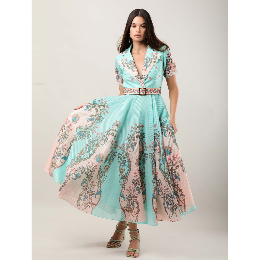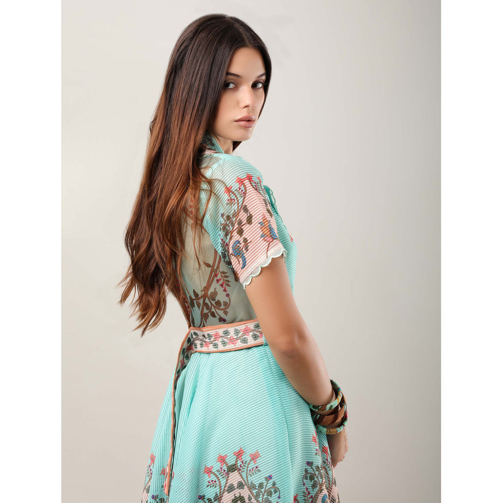 Make a statement with this calf-length dress, crafted from striped organza and inspired by the timeless artistry of Kalamkari paintings. Featuring engineered prints in rich, earthy tones, it showcases motifs of flora, fauna, and traditional storytelling elements that echo heritage craft. A sheer back with delicate mirror embroidery adds a whimsical detail, while scallop cutwork embroidery accents the statement lapels and sleeve hems. Finished with a engineered print belt buckle, this dress seamlessly marries artisanal tradition with contemporary elegance.