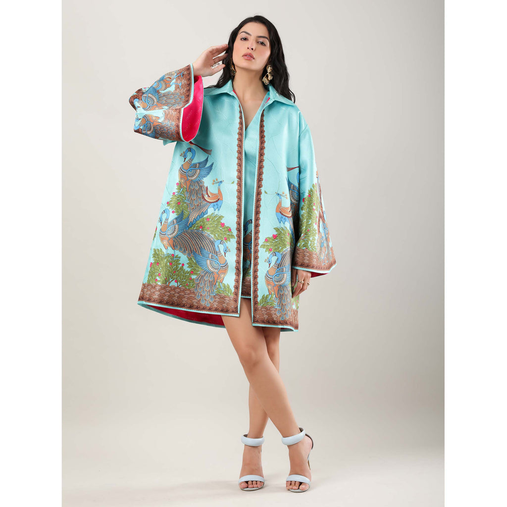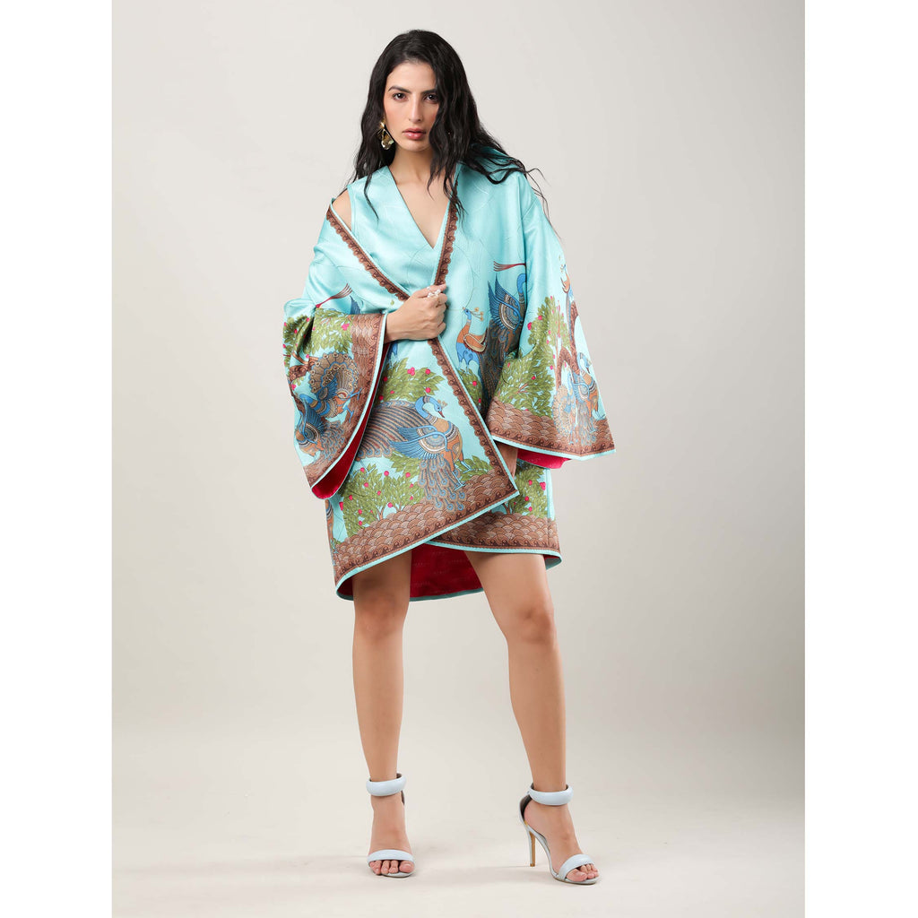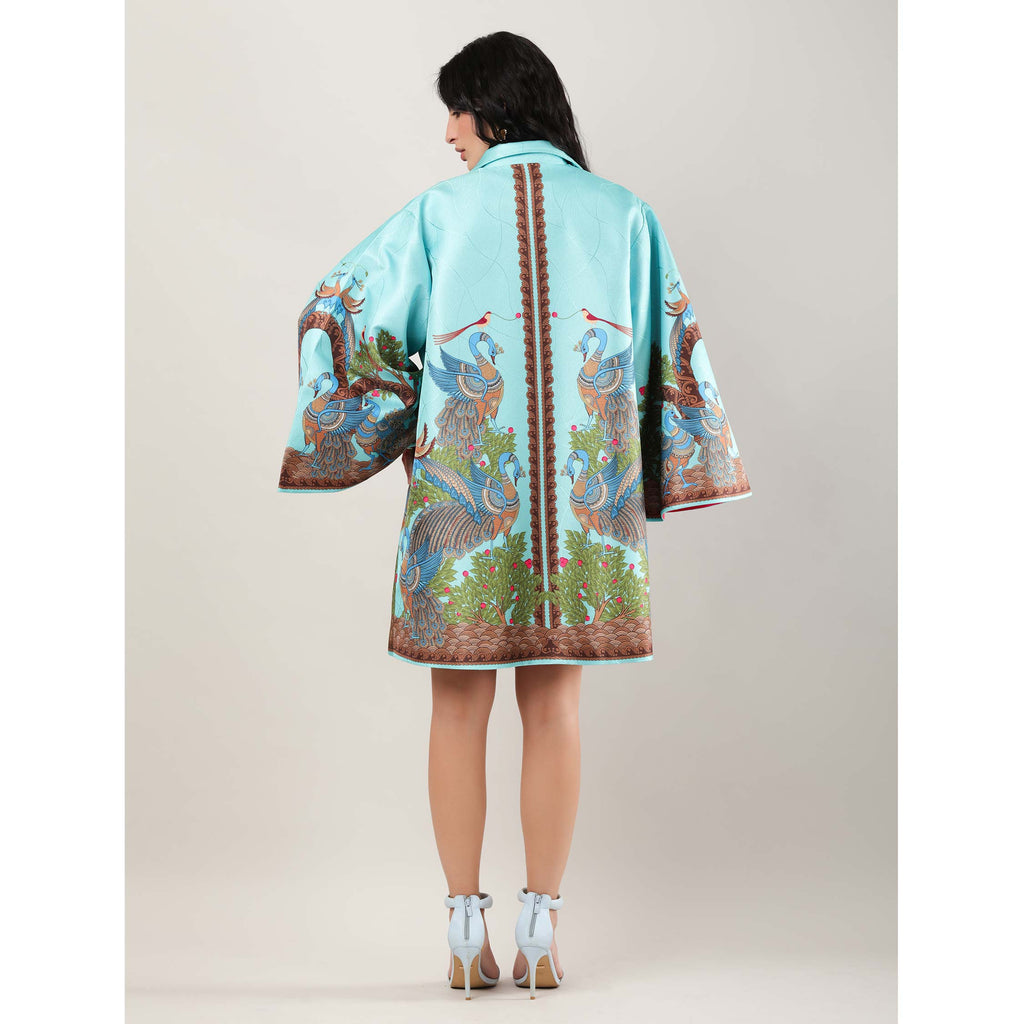 Elevate your wardrobe with the Dorell jacket, a statement piece crafted in luxe textured satin and adorned with engineered prints inspired by the artistry of Kalamkari paintings. Designed with an oversized silhouette and dramatic bell sleeves, it blends traditional motifs with contemporary tailoring. Perfect for city nights or special occasions, this jacket ensures you command attention with effortless elegance.