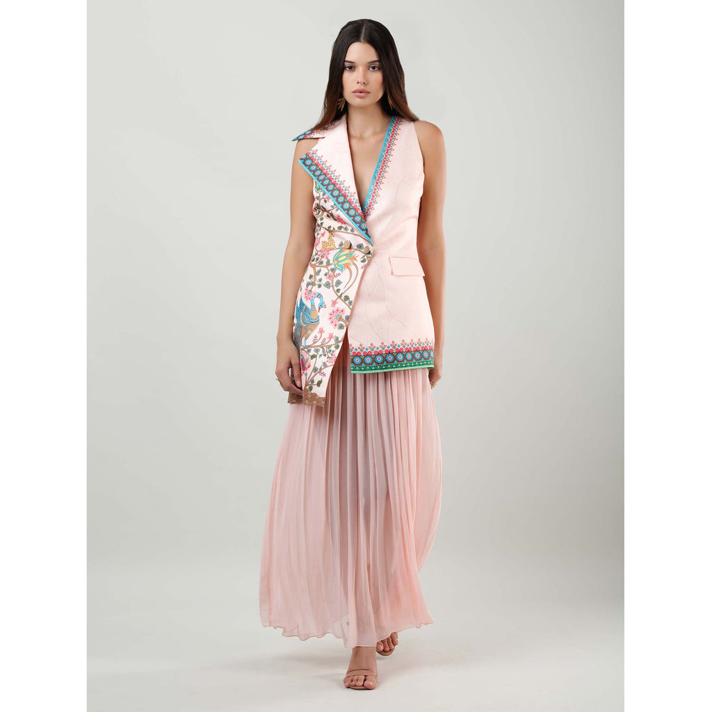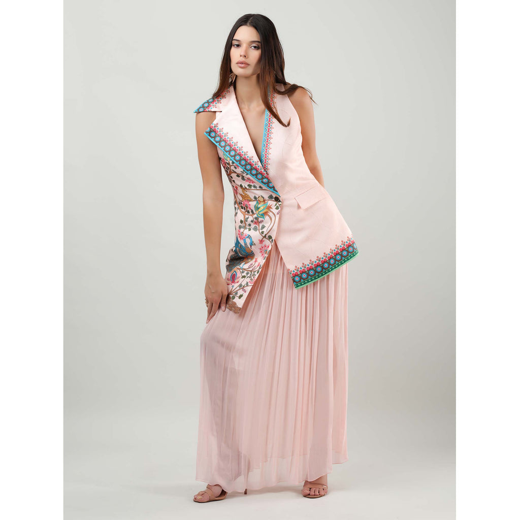 A statement of contemporary elegance, this jacket dress is crafted in textured satin and georgette fabric for a textural play of structure and fluidity. Featuring an exaggerated single-side collar and accented with gleaming golden buttons, it exudes a refined yet bold aesthetic. Designed to stand out, this piece transforms effortlessly from a sophisticated day look to an evening statement.