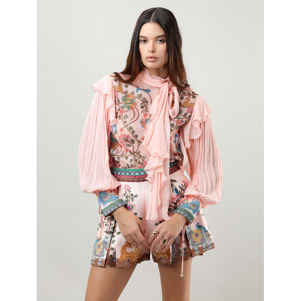 Add a touch of artisanal elegance to your wardrobe with these Kalamkari-inspired shorts , crafted in textured satin fabric for a subtle textural appeal. Featuring an inverse box pleat at the front, they offer a structured yet fluid silhouette. Perfect to pair with a coordinating top or jacket, they bring effortless style and craftsmanship to any occasion.