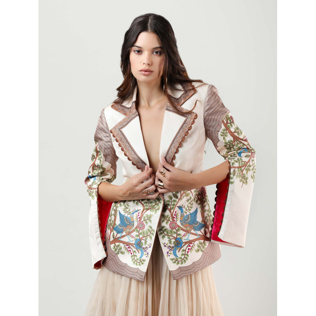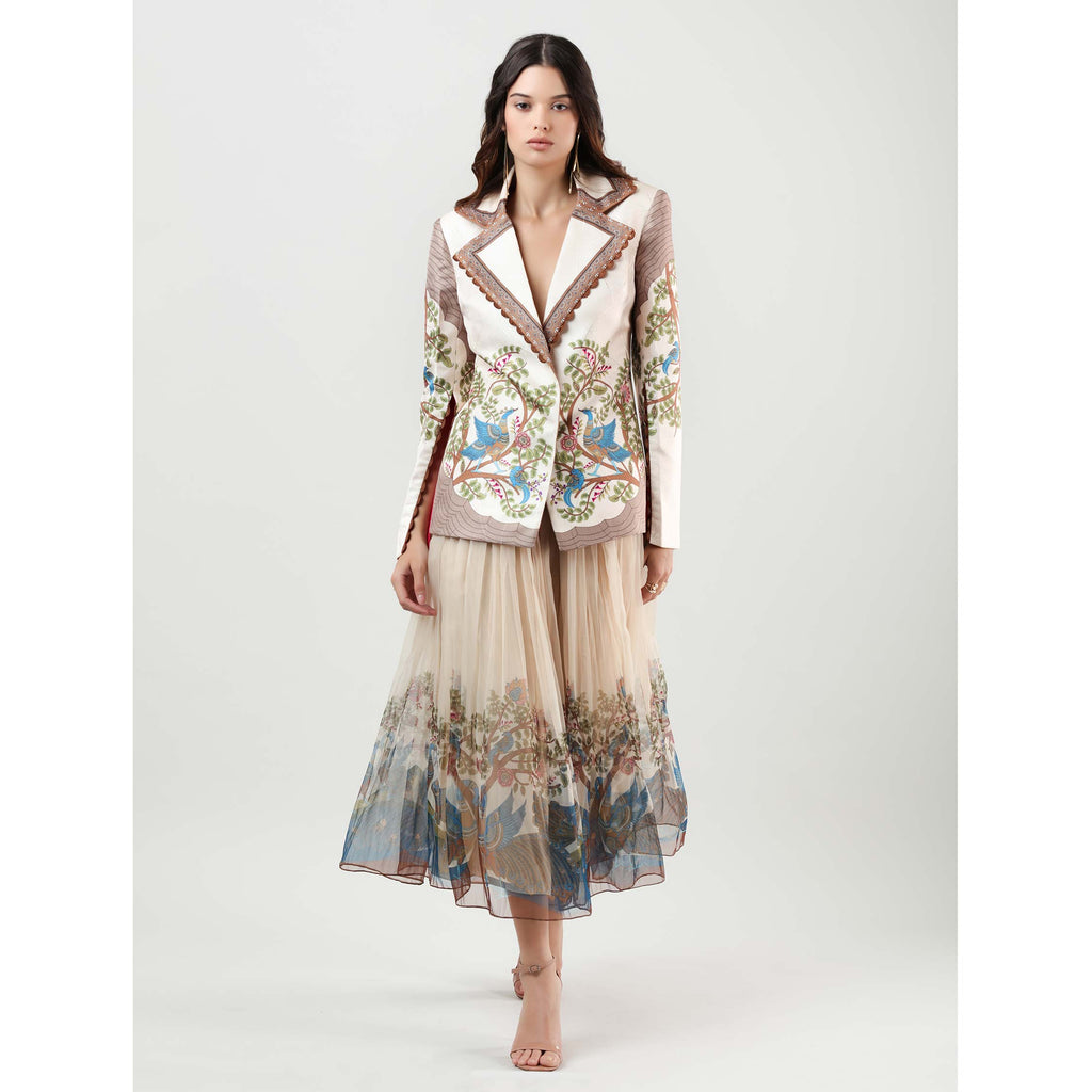 Inspired by Shrikalahasti art and crafted in ethereal organza, this full-length skirt features a sheer overlay that adds fluidity and dimension with every step. Its softly flared silhouette evokes quiet sophistication, making it the perfect choice to pair with the matching jacket for a refined, coordinated look — or with a minimal blouse to let the intricate artwork command attention.